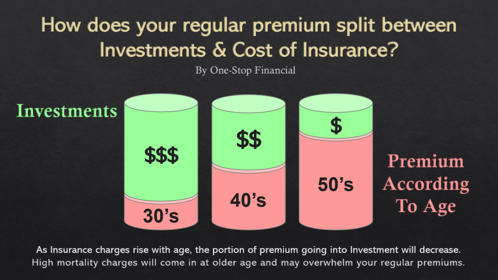 Insurance costs will increase with age. As we grow older, we also increase our risk of developing illnesses. Over time, the insurance costs may no longer be covered by the units bought with your premiums. Then you may end up with little or no investment. Some then resort to reducing insurance coverage in order to maintain the investments.