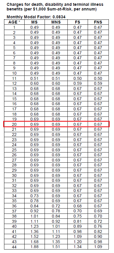 * Red will be the mortality table charges for Death, Total and Permanent Disability (TPD) and Terminal Illness (TI)