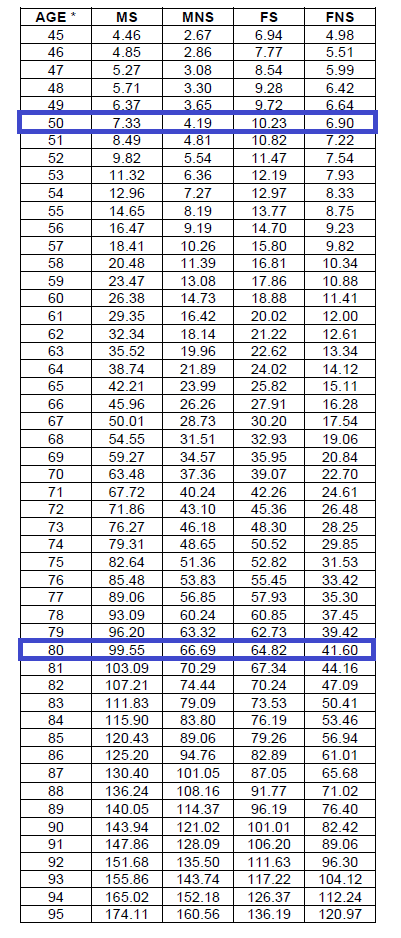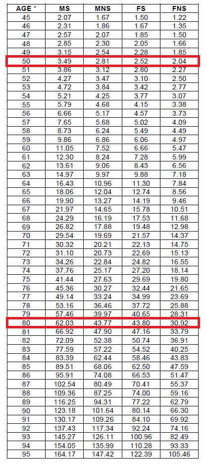 In the calculation below, we will be taking the age of 20, 50 and 80 for calculation with the following criteria: